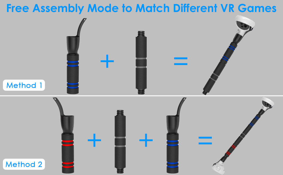 One Accessory. Multiple Play Styles Transform your gaming experience with our versatile 2-in-1 design! Detach and combine each handle, transforming it into a long handle, allowing you to switch between double handle mode and long handle mode to suit your VR game needs, enabling you to play your way.